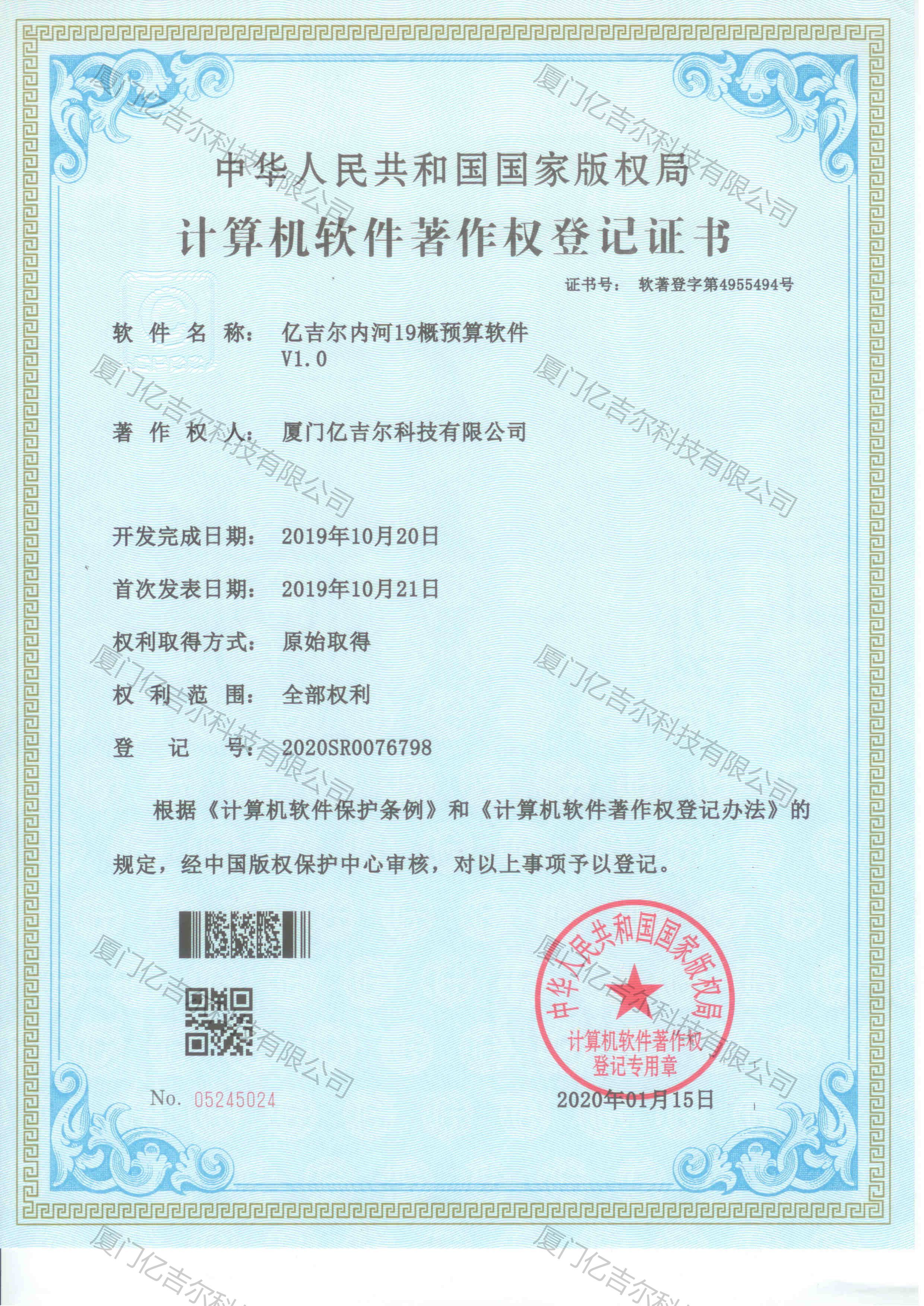 億吉爾內(nèi)河19概預(yù)算軟件著作權(quán)登記證書 發(fā)布日期:2020年01月15日 瀏覽次數(shù):3642 關(guān)鍵字: 公司 1/1億吉爾內(nèi)河19概預(yù)算軟件著作權(quán)登記證書