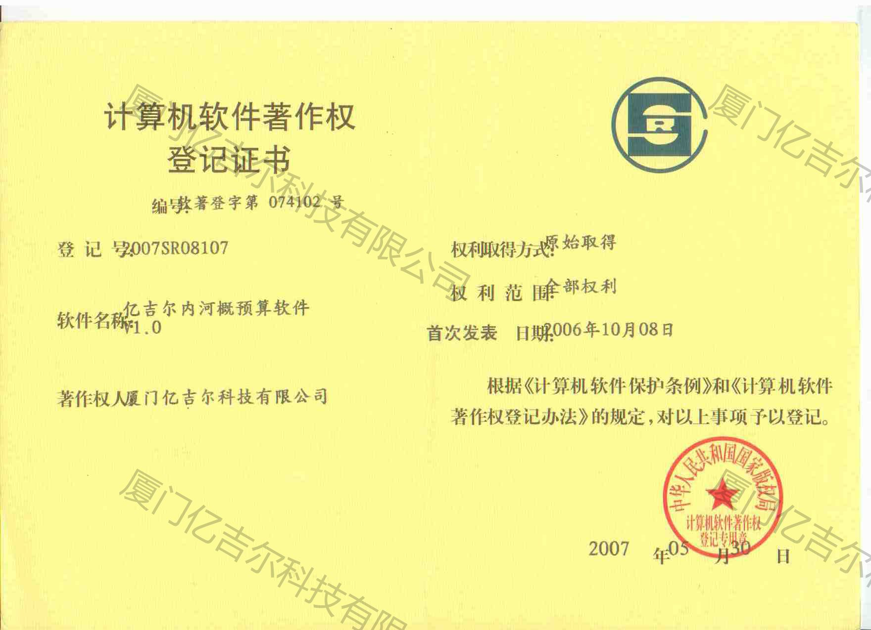 億吉爾內(nèi)河概預(yù)算軟件著作權(quán)登記證書 發(fā)布日期:2007年05月30日 瀏覽次數(shù):3295 關(guān)鍵字: 公司 1/1億吉爾內(nèi)河概預(yù)算軟件著作權(quán)登記證書