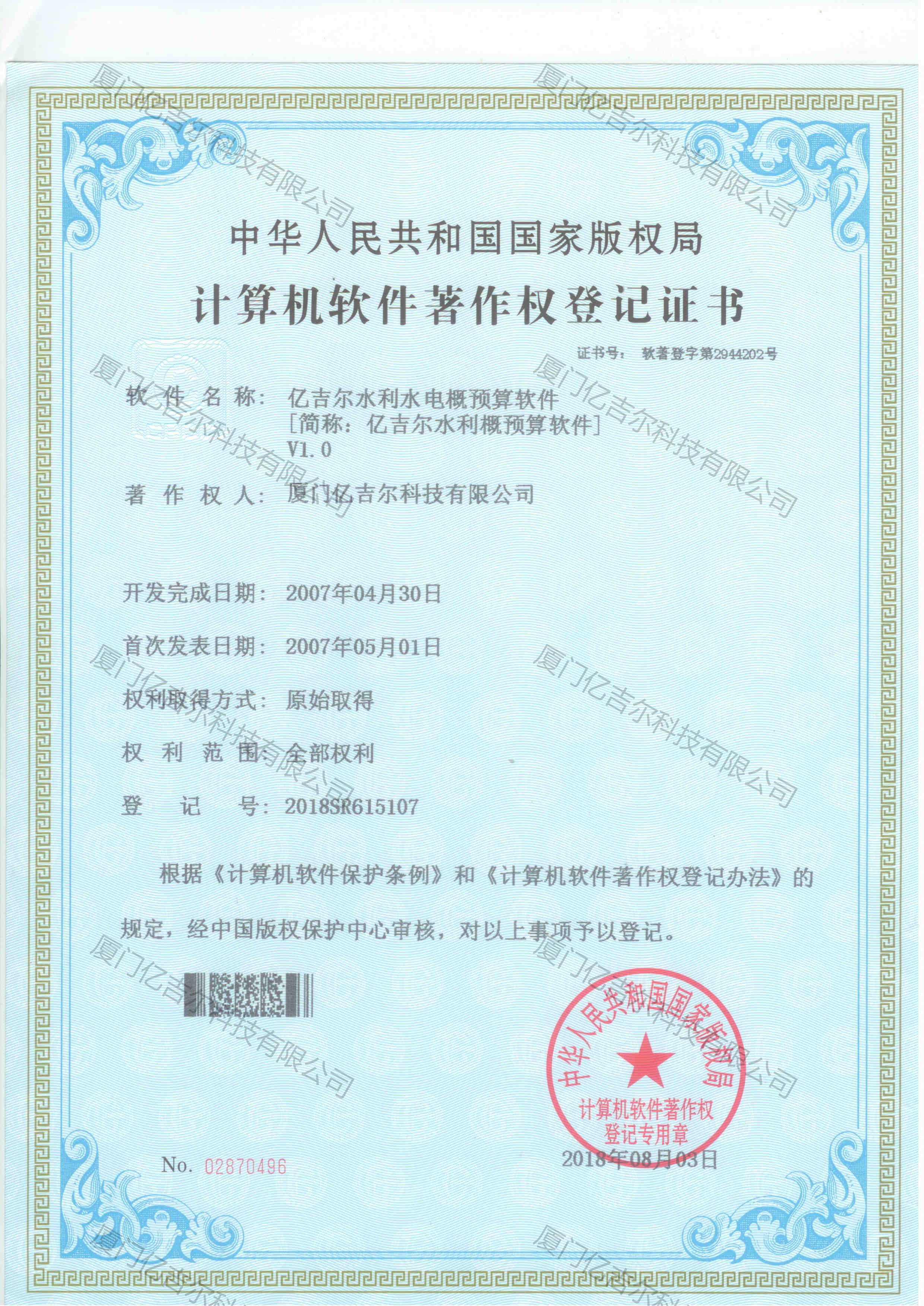 億吉爾水利水電概預(yù)算軟件著作權(quán)登記證書 發(fā)布日期:2018年08月03日 瀏覽次數(shù):3377 關(guān)鍵字: 公司 1/1億吉爾水利水電概預(yù)算軟件著作權(quán)登記證書