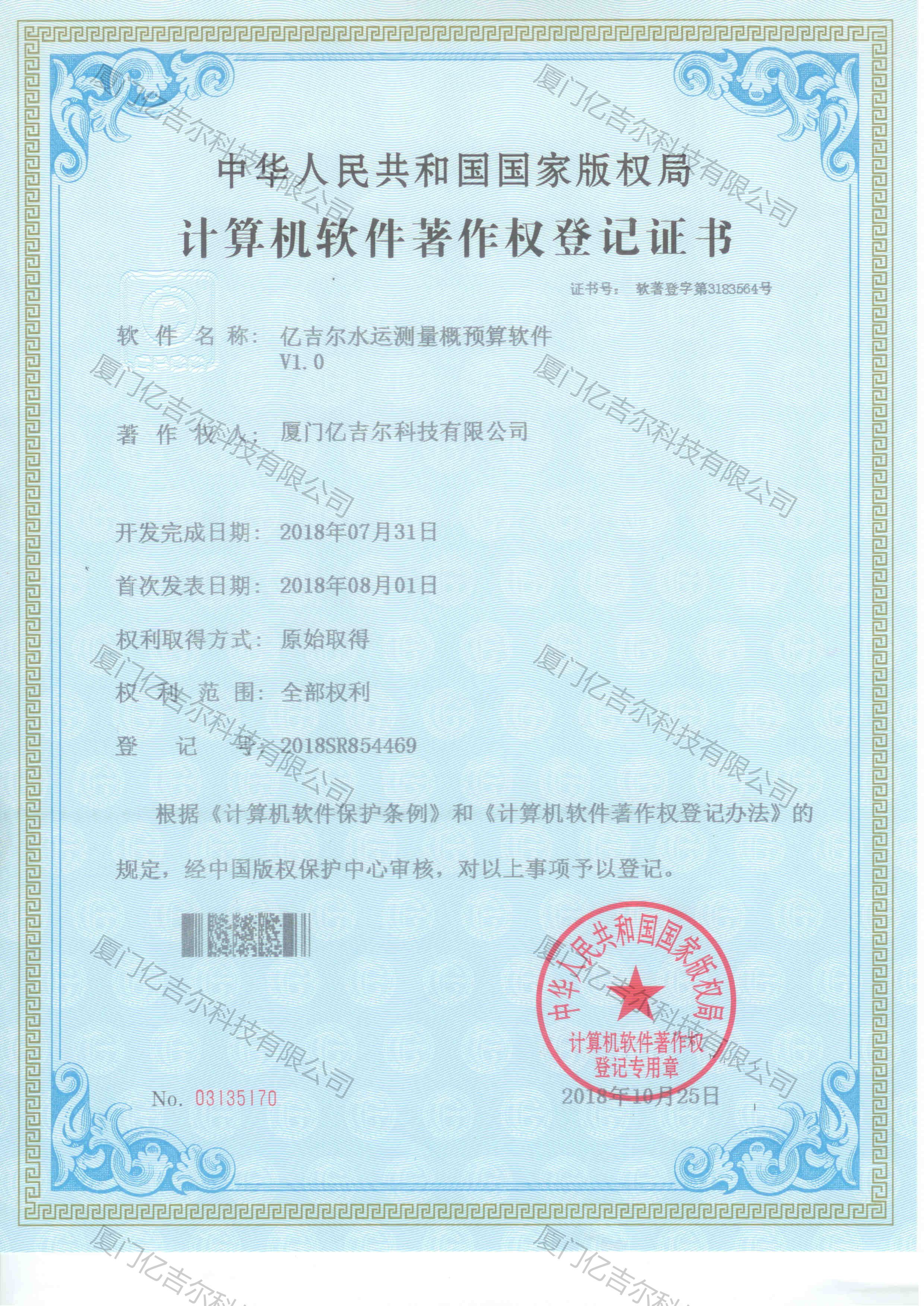 億吉爾水運測量概預(yù)算軟件著作權(quán)登記證書 發(fā)布日期:2018年10月25日 瀏覽次數(shù):3373 關(guān)鍵字: 公司 1/1億吉爾水運測量概預(yù)算軟件著作權(quán)登記證書